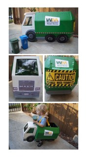 • My son was almost 2.5 when he wore the first version I made. It was a bit heavy and it was cumbersome for him to walk in. He was not that into trick or treating so we only went to a few neighbor’s houses. He was thrilled with how it looked. The next year, he wanted to be a garbage truck again and I changed the design so that it strapped on like a backpack. He was bigger kid at that time but it was also a better design. I’ll have to take a look and see if I have any pictures posted of that one so you can understand what I mean.