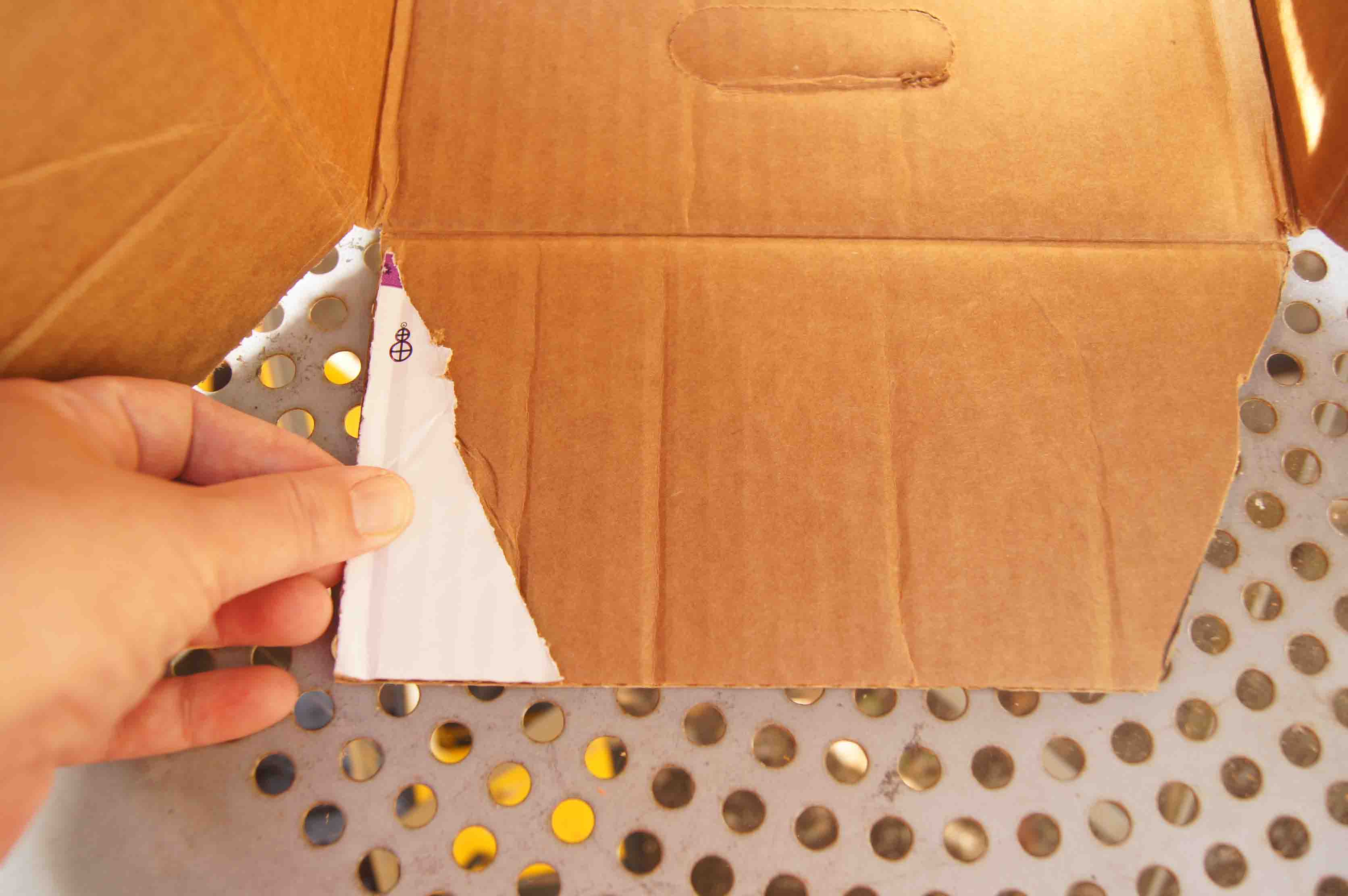 2. Speaking of the flaps. After you have trimmed 2 inches off every flap piece, both on the top and bottom of the box, you are ready to determine the angles for the beveled edges of the hopper. You have the short end flaps and the long end flaps. Angle the long edge flaps in against the short end flaps. Draw a line. Cut that piece off, I used a kitchen knife. This little triangle will become your template for every other angle cut. This is a super fast, easy way to insure your angles are symmetrical.