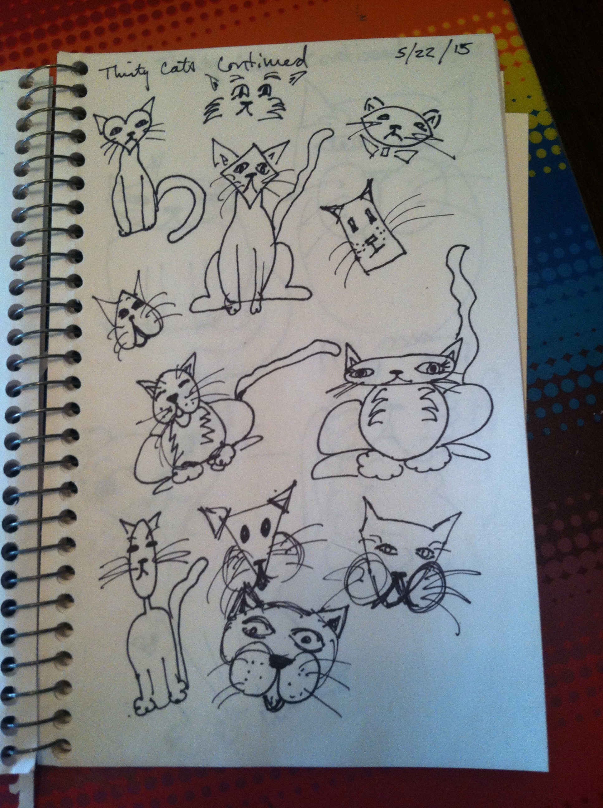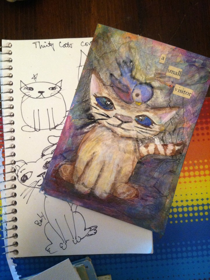 A while back I purchased a book called, Drawing Lab For Mixed Media Artists by Carla Sonheim. I bought it on my Nook and them promptly forgot about it probably because I had the little ones to contend with and didn’t have much time for making art. I rediscovered it Yesterday and did the first exercise today which was to draw thirty simple line drawn cats and then pick one to make into a piece of artwork.