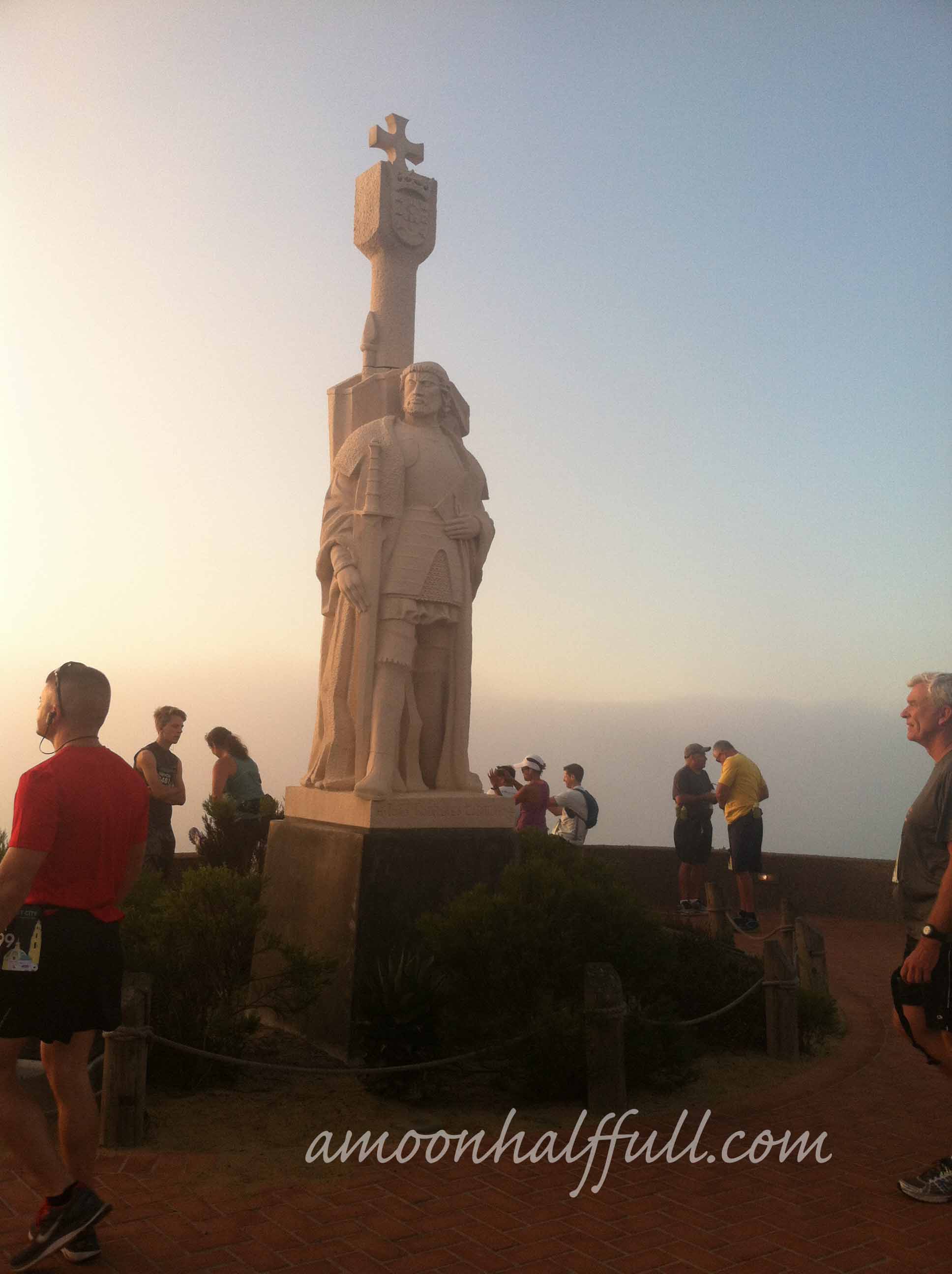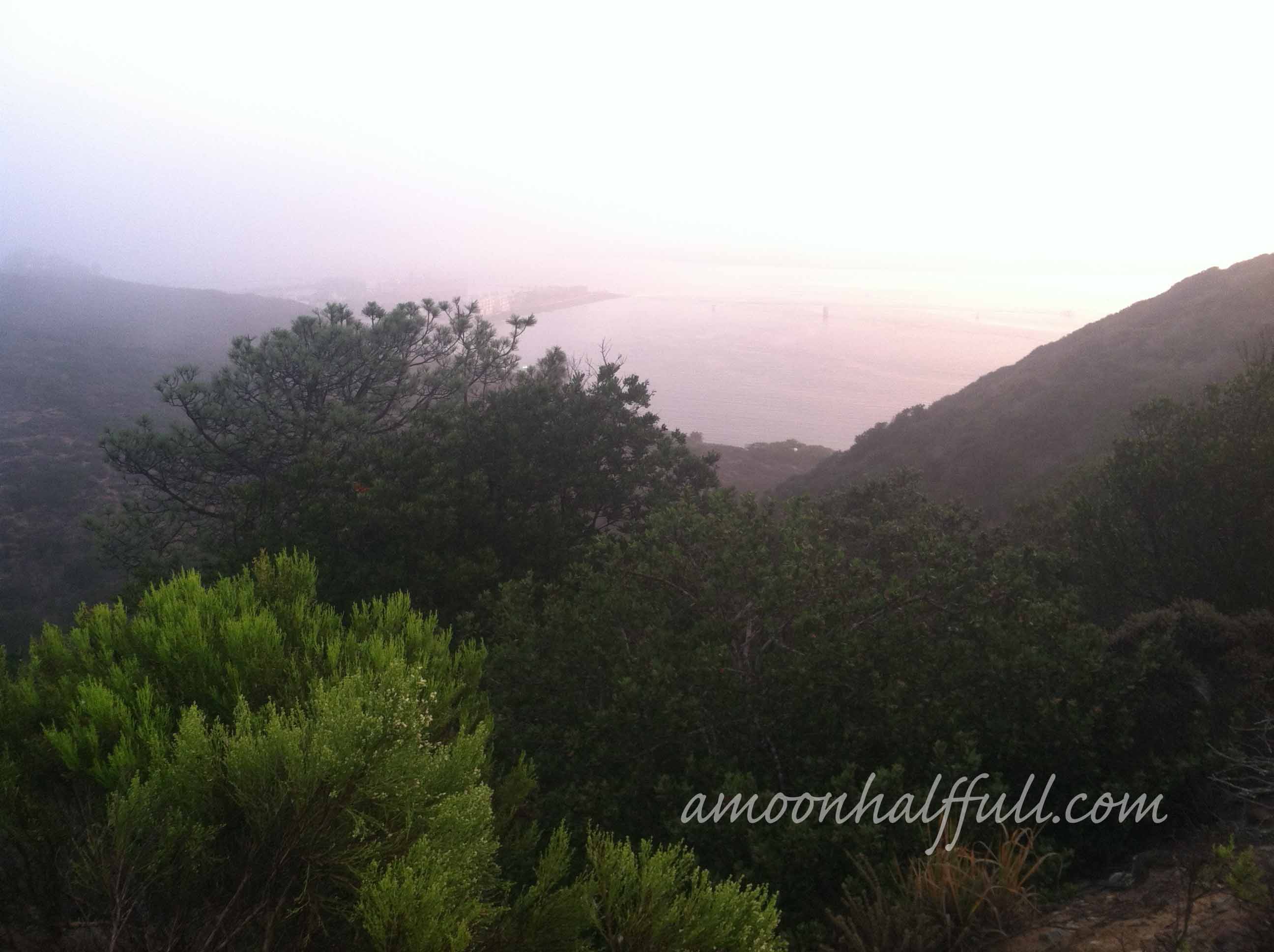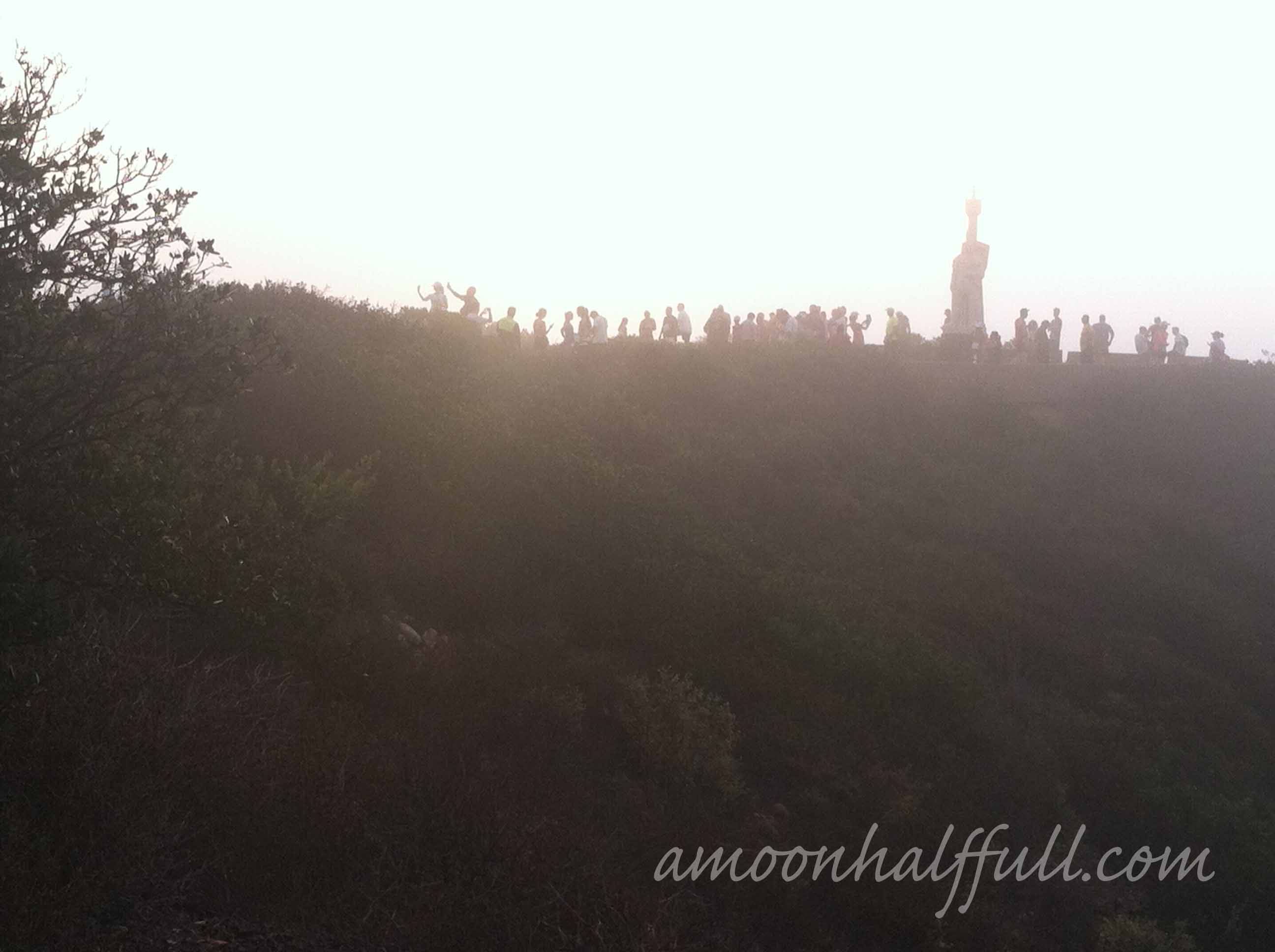 I went to bed at 10pm with my alarm set for 3am. I was unable to sleep all night which usually happens the night before a race, no sleep. I am always pleasantly surprised when I actually get some sleep the night before and it is amazing the difference it makes in my performance. I digress. 3am my alarm goes off, I get dressed and head down stairs to gather up my stuff and have some coffee. I was feeling hungry so I ate some Greek yogurt. I grabbed my PB&J, my electrolyte drink, and my packed up Camelbak and headed out the door at 3:45am. Heading into Balboa Park I experienced no traffic. I parked easily in the zoo parking lot and went to get on the buses. It was around 4:20am by now. The buses were scheduled to start transporting us at 4:30am. The bus drove us to Point Loma to the Cabrillo Monument. I am guessing we got there around 5:15am. It was dark and chilly. I didn’t bring a jacket or a trash bag to wear because it was going to be warm that day and all I could think about was how hot I was going to feel. It was much warmer at my house and at Balboa Park than it was up at Cabrillo Monument. I wasn’t complaining and was just trying to absorb the chill to my bones to store up for later. It didn’t work BTW. Once the sun came up at about 6:15, it warmed up plenty fine. When the sun first came up, it was foggy. The views from the point were very obstructed. I could barely see the light house through the thick mist. I tried to get a picture of it obscured by the mist but I just couldn’t capture it.What a lovely place to hang out waiting for a race to start. I recommend using the ample time you have waiting for the race to start to explore this place. I don’t think I made the most of it because I was busy chatting it up with some fellow runners. I hadn’t been to Cabrillo Monument since I was in 4th grade and had gotten in trouble by the park ranger for “stealing” pennies out of the fountain. I might need to take a visit up there real soon.